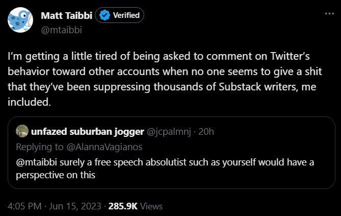 I doubt anyone will be surprised, at this point, to learn that our self-appointed “Free Speech Champions” have had nothing to say about this. Glenn Greenwald, for example — who openly ridiculed concerns about Elon Musk’s takeover and obliviously praised its “potential…restoration of free discourse” as “exciting and encouraging” — has exclusively focused on Tucker Carlson’s ongoing litigation with Fox News. Meanwhile, when Matt Taibbi was asked for comment, this was his response: