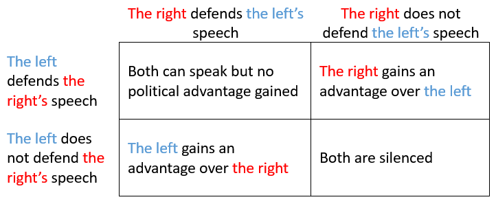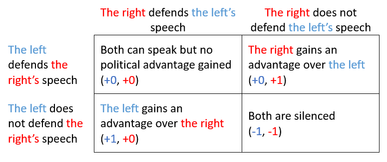 Readers who have even a passing familiarity with game theory should immediately recognize this table as sketching out a variation on the famous Prisoner’s Dilemma. For both sides, the best possible outcome is if your opponent defends your speech while you betray them. If both sides choose to pursue this outcome, however, then they could hypothetically get the worst of both worlds: a free speech regime where neither gains a real advantage and both are routinely silenced. Therefore, liberals insist, we should both agree to pursue the first outcome: we defend each other’s speech, and thus while no one gains a political advantage this way, no one gets censored, either.