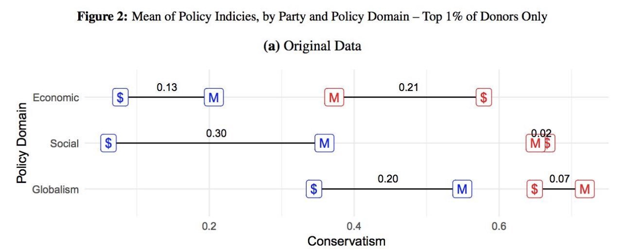 This comes from an unpublished research note that the authors titled “What Do Donors Want? Heterogeneity by Party and Policy Domain”. In it, the authors attempt to show that among Democrats, rich donors are to the left of another group. What group? Don’t ask David Shor, who has variously described them as