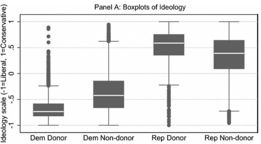 Why? Because this paper is really a comparison of 1) a group that excludes nondonors to 2) a group that includes them. And as a matter of both common sense and empirical fact, nondonors are obviously less partisan than donors. A 2017 study on this makes it clear: