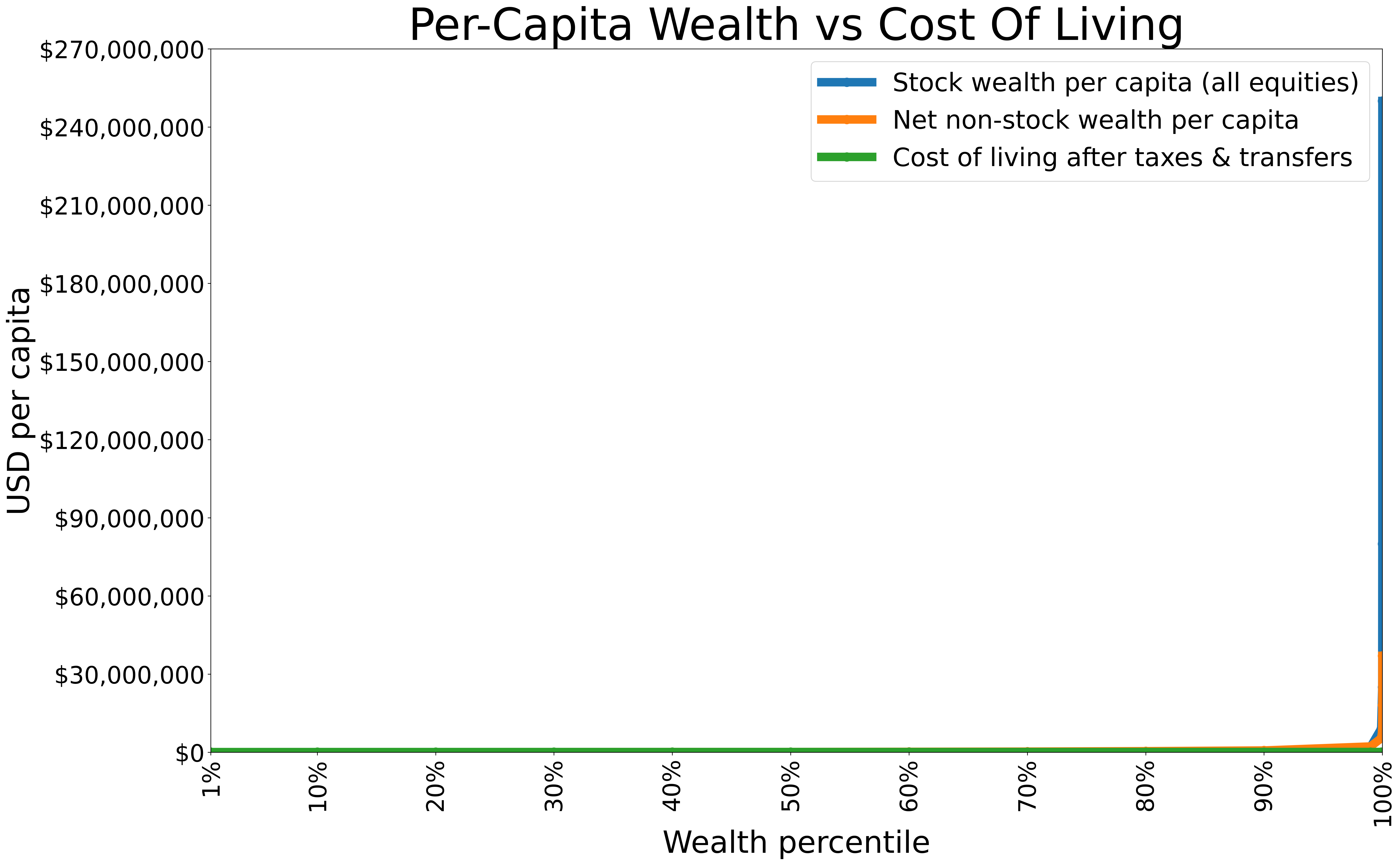 At a casual glance, the chart above probably looks like an ordinary graph of wealth inequality in the United States. It captures all kinds of crucial trends that define economic life in this country — for example, that the bottom quintile has negative wealth (they’re in debt), and that 45% of the country are making less than the national cost of living.
