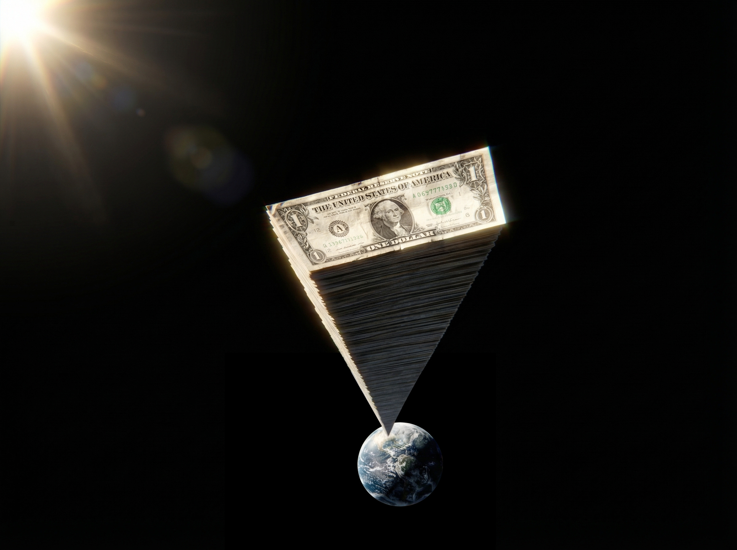 Popular science writers are fond of using thought experiments and analogies to help readers understand massive numbers, and this is a habit that socialists would do well to cultivate as well. Imagine for example if we stacked the median American’s personal wealth in dollar bills. It would be about 69 feet tall, or the height of a typical medium-sized tree, which at first glance seems quite impressive. But with some careful math and considerable help from Photoshop, I’ve created a visualization of what this would look like if we did the same thing for Elon Musk: