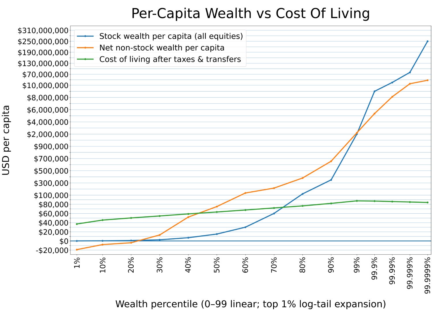At a casual glance, these are the kinds of questions you might ask. But if you look a little closer at the graph, you’ll notice something strange: neither axis is linear. The Y scale grows first in $20k increments, then in $200k increments, then $2m increments, and finally in $60m increments. The effect, then, is to take a very close look at people who have less than six figures in wealth, and then to wildly distort the rate of growth in upper wealth ranges. The X axis, meanwhile, proceeds in ten percentile increments until the very end, where we zoom in on the top 1%, and then the top .01%, .001%, and .0001%. This also has the effect of distorting just how wealthy the wealthiest Americans actually are.