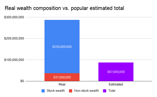 Scope insensitivity is a serious and underdiscussed1 obstacle to understanding wealth, but I’d like to conclude this post by drawing attention to a point that has otherwise gone unremarked. Earlier we noted that Americans tend to underestimate how rich the rich are by about 80%. That means that if we compare the wealth composition the richest Americans to this popular estimate of their total wealth, we get something like this: