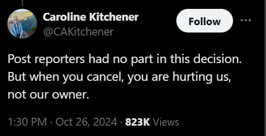 So we’re also getting a lot of takes from journalists urging readers not to boycott, like Don’t Cancel Your Subscription to the Washington Post from Laura Miller: