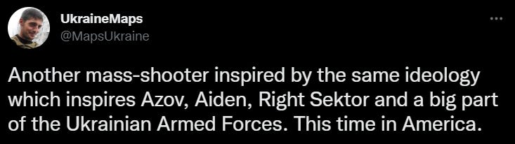Less than five minutes after news broke that a teenager in New York had murdered ten victims in a mass shooting, Twitter found a way to blame it on Ukraine. The line seems to have originated from a series of tweets by pro-Russia account UkraineMaps: