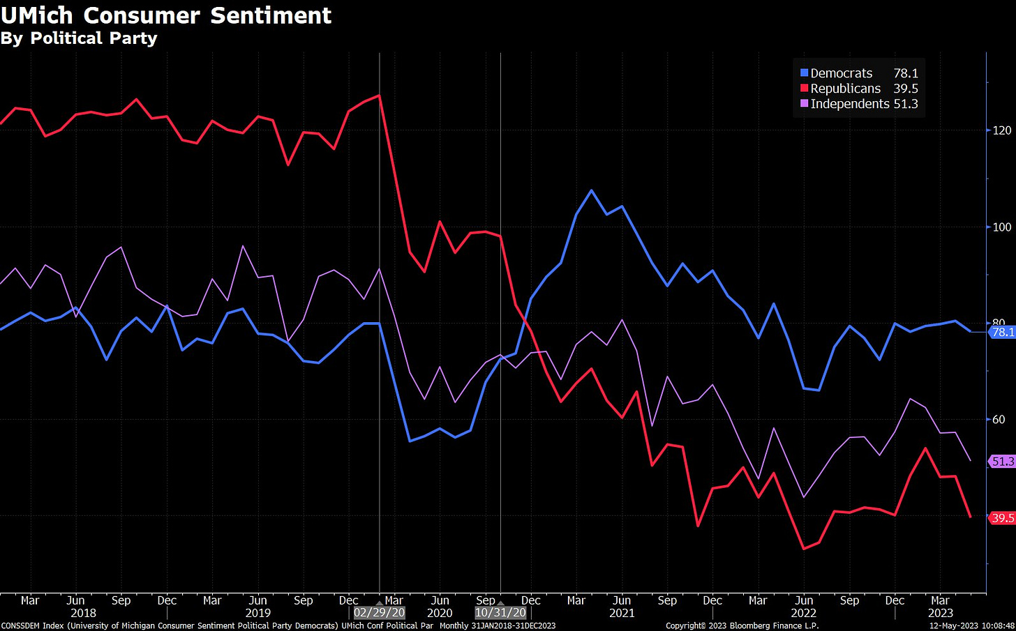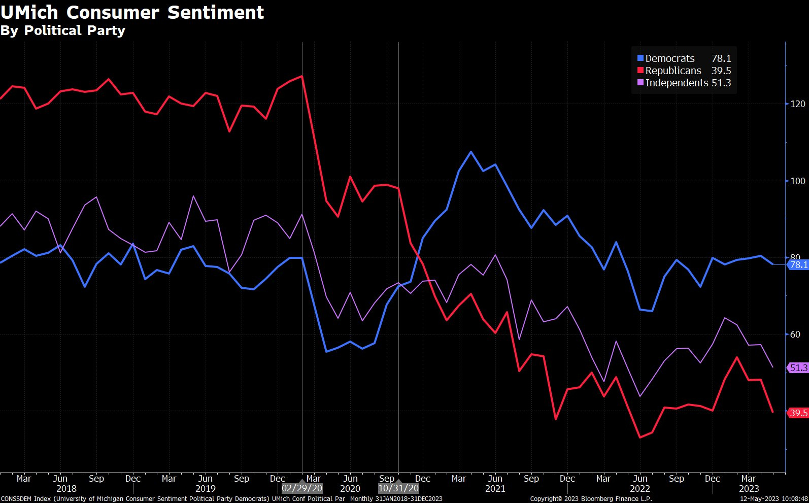 No one is surprised, of course, that right around the election of Joe Biden a surge of Democrats decided that the economy is doing pretty good. Or that Republicans, at the exact same time, decided that the economy is doing terrible — giving us the hilarious red and blue X in the center of the graph. But what bodes ill for Biden, we are told, is that “Independent” sentiment towards the economy is also lagging behind Democrats; they “view the economy more like Republicans view the economy,” as Joe Weisenthal puts it.