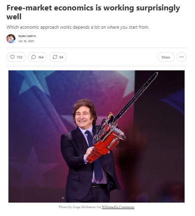 “I think the purely economic advantages are also too often ignored. Exhibit A is Javier Milei’s track record in Argentina. A year and a half ago, when Milei was elected President of Argentina, a bunch of left-wing economists warned darkly that his radical free-market program would lead to economic devastation… [but] Milei’s austerity shock therapy…seems to be working.”