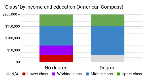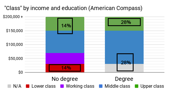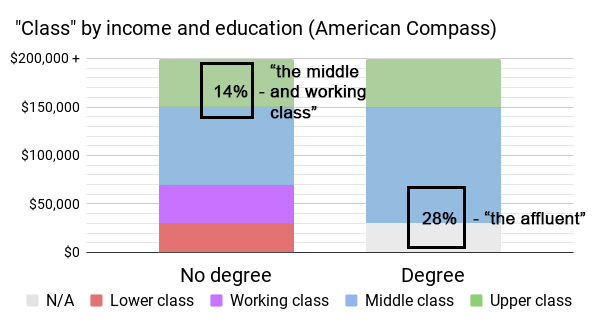 Already we can see some wild stuff going on here. For one thing, you can make as little as $30,000 and the AC will still call you middle class, just as long as you have a college degree. Here’s another: have a degree and make less than that?