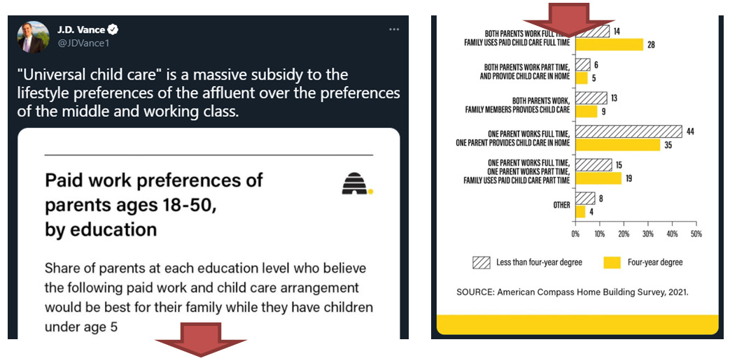 These numbers could come from anywhere! Maybe well-off people like paid child care more than poor people do, or maybe poor people like it more than well-off people do. There’s just no way to know from Vance’s chart how his numbers map onto AC’s theory of class, much less how it maps onto income levels.