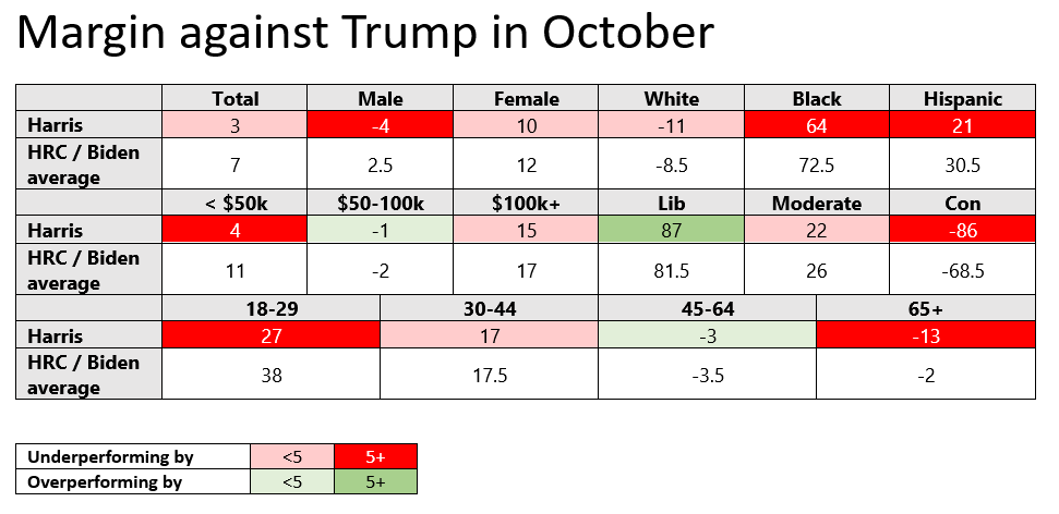 So here’s a chart of Kamala’s margins against Donald Trump — compared with the average margins of Hillary Clinton and Joe Biden in October during their elections: