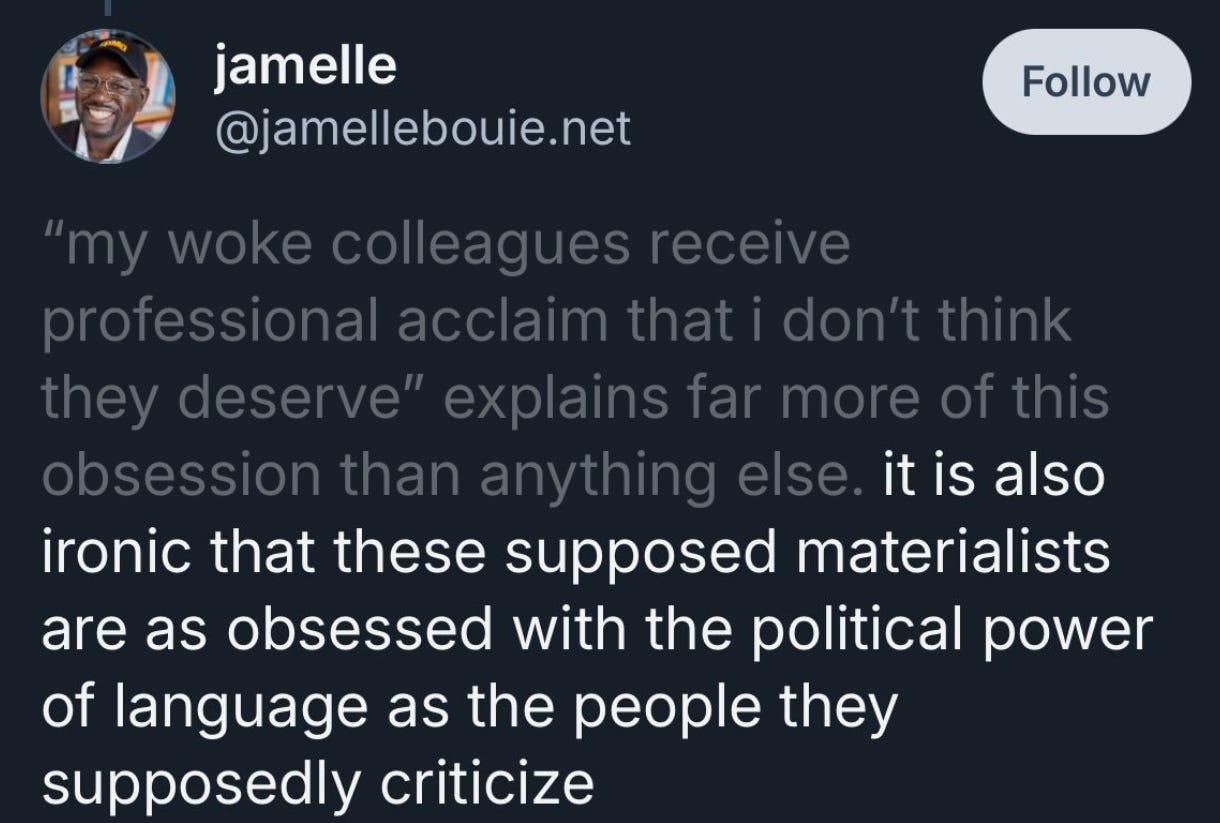 As a cheap way to argue that Marxists shouldn’t participate in the discourse or have opinions about what anyone says, this line has long been a favorite gotcha among liberal pundits. As commentary on what Marxists actually believe, however, this has never really made much sense. Do Marxists, in the world of Jamelle Bouie’s imagination, actually believe that language has no relationship with politics?
