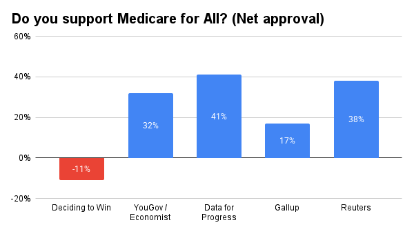 Welcome’s opposition to Medicare for All isn’t just at odds with their kind words for Bernie Sanders, however. It’s also at odds with the proposal’s well-documented and persistent popularity. In their review of “What Is Popular and What Is Not,” DtW claims that net support for Medicare for All is at -11%. But here’s how their numbers stack up to other recent polling: