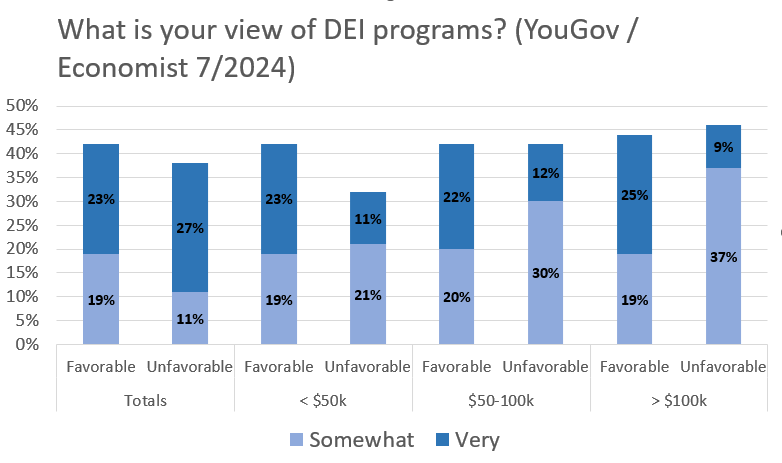 The crosstabs of this poll tell a familiar story: support for DEI is highest among women, nonwhites, and young people, while opposition is highest among men, white people, and the old.