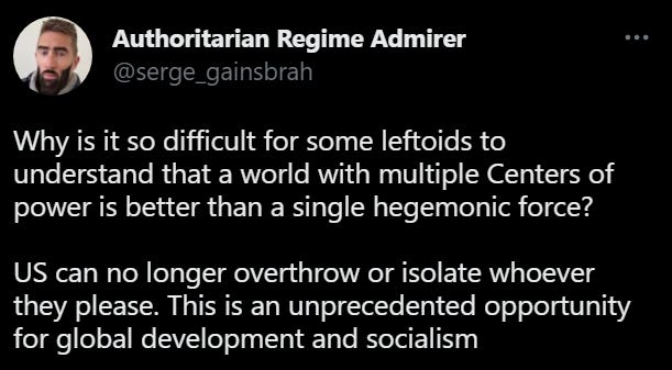 Among multiple schools of contemporary radical thought — and not just in the US, but all over the world — one can find the same implicit premise: a multipolar world would get us closer to global socialism. It’s one of those things that is usually just left implicit, though occasionally someone will say it out loud: