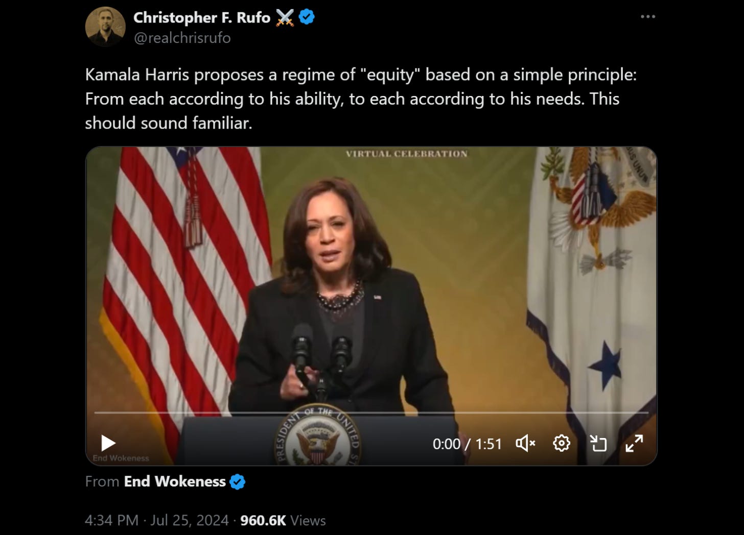 I barely needed to watch the video to know that infamous liar Chris Rufo was lying once again. No need to take my word for it: just watch the video for yourself. Harris talks a lot about equity in these clips, but she never even comes close to saying “From each according to his ability, to each according to his needs.” That Rufo added that this “should sound familiar” makes it hard not to read it as a deliberate attempt to sucker his audience into thinking those sounds actually came out of her mouth.
