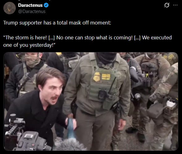 One reinforces the other. Noem, for example, knows perfectly well that there is no significant national trend of vehicular attacks by the left — in fact, as I wrote six months ago, the well-documented trend is vehicular attacks by the right. She knows, moreover, that there is zero evidence that this incident was coordinated or that anyone was “trained” to attack ICE with their car. And more to the point: she knows that we know she is lying. Just as Vance knows that it is not actually reasonable to call Good a terrorist, and just as Ahmari knows that his clip doesn’t remotely prove anything.