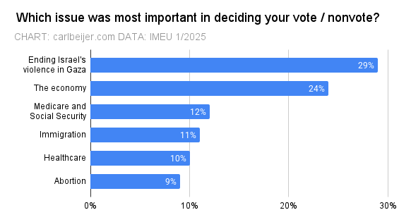 First, early in the afternoon, a new poll revealed that the Israel-US war on Gaza was the leading issue for Biden 2020 voters who did not support Kamala Harris: