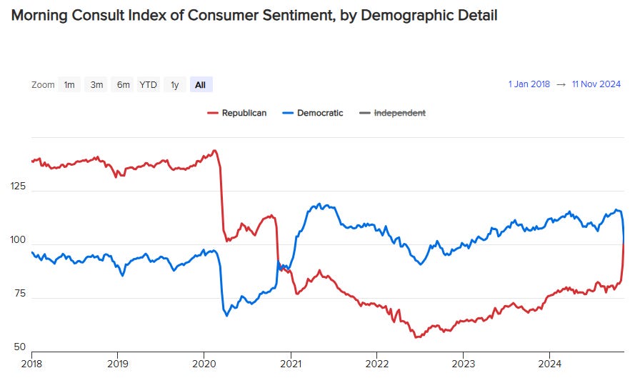We’ve been talking a lot about consumer sentiment in recent months, typically just by looking at total numbers. But you can, of course, always carve survey numbers like this up by demographic — and when you parse them by partisan alignment, a completely unambiguous trend jumps out. Just look at the chart above: when Trump was in office, consumer confide…