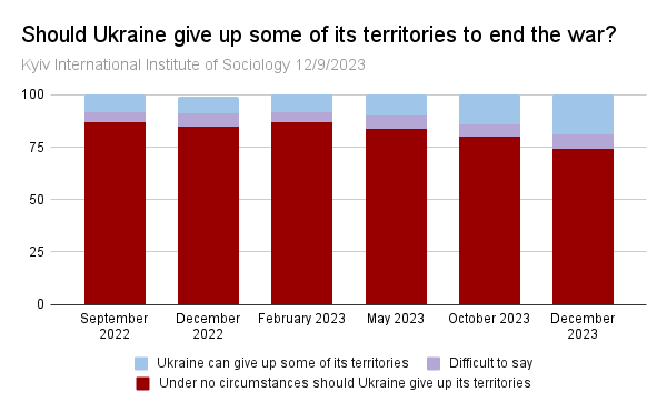More than a quarter of Ukrainians — that’s around eleven million people — either support or are on the fence about giving up land for the sake of ending the country’s war with Russia. This sentiment has been growing steadily since 2022, and if the trend holds it is even higher today. And this isn’t some anecdotal impression of public opinion or even some sinister line of Russian propaganda: this is coming from one of the most respected polling operations in Ukraine, the Kyiv International Institute of Sociology, who has been tracking sentiment on this question since the war began.