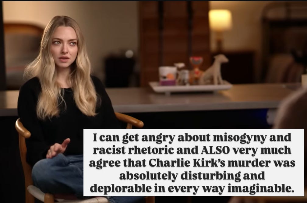 The right started spinning every instance of criticism of Kirk, and even failures to praise Kirk with adequate worship, as celebrations and justifications of his death. A typical example from just yesterday: in a viral post promoted by figures like Elon Musk and organizations like the Mises Caucus, an anonymous user claims that actress “Amanda Seyfried said he deserved it.” The actual post: Seyfried simply said that “He was hateful,” later adding “I can get angry about misogyny and racist rhetoric and ALSO very much agree that Charlie Kirk’s murder was…deplorable in every way imaginable.” This kind of gross characterization of fair criticism was the rule. The right of course also found the marginal instances of actual celebration of Kirk’s death and aggressively hyped them as examples of what the entire left was doing, but this was not in fact a reasonable representation of what was happening.